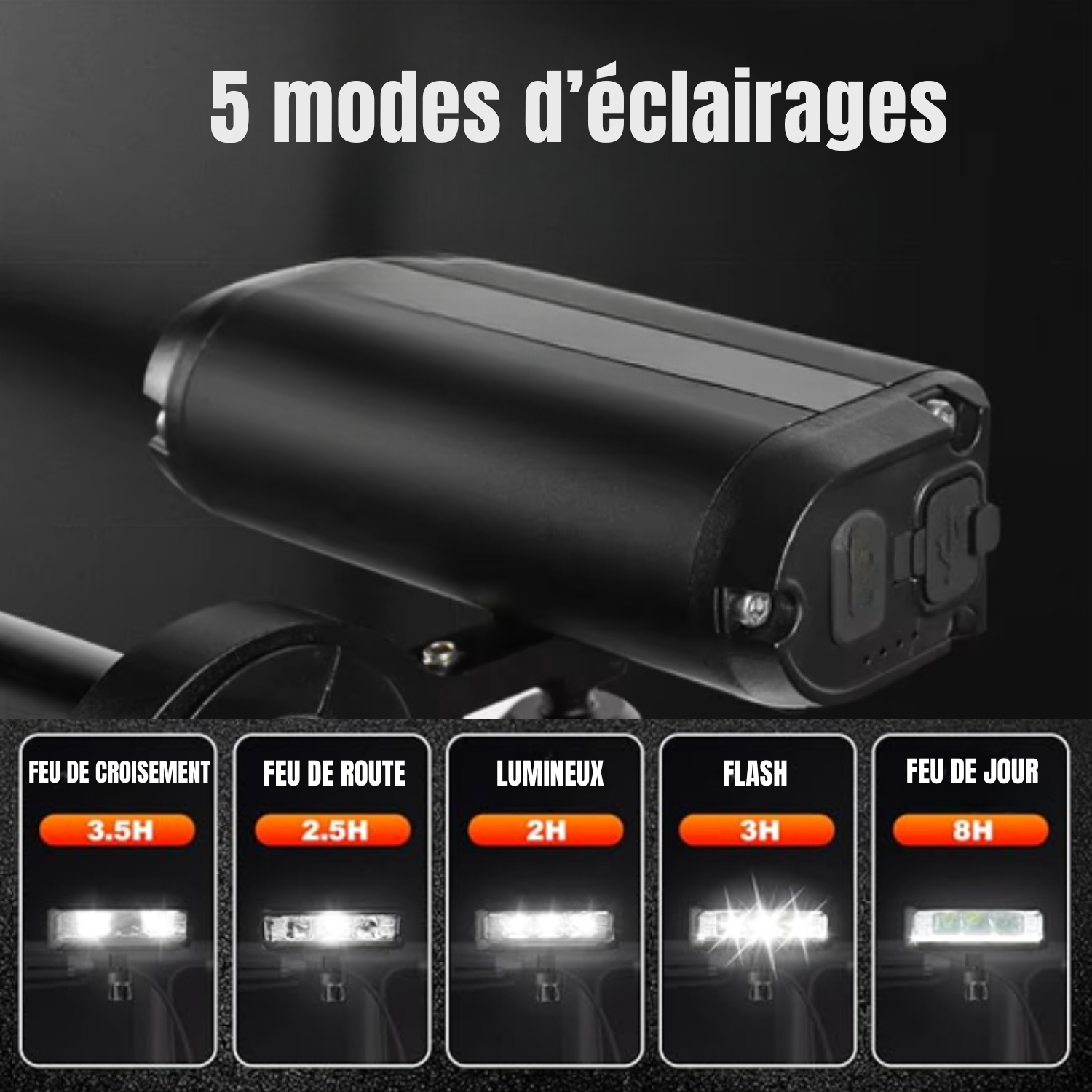 Avec ces cinq modes d'éclairage, votre lampe de vélo multiusages s'adapte à toutes les situations, garantissant une sécurité optimale et une visibilité sans pareil